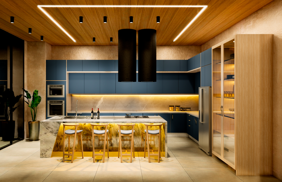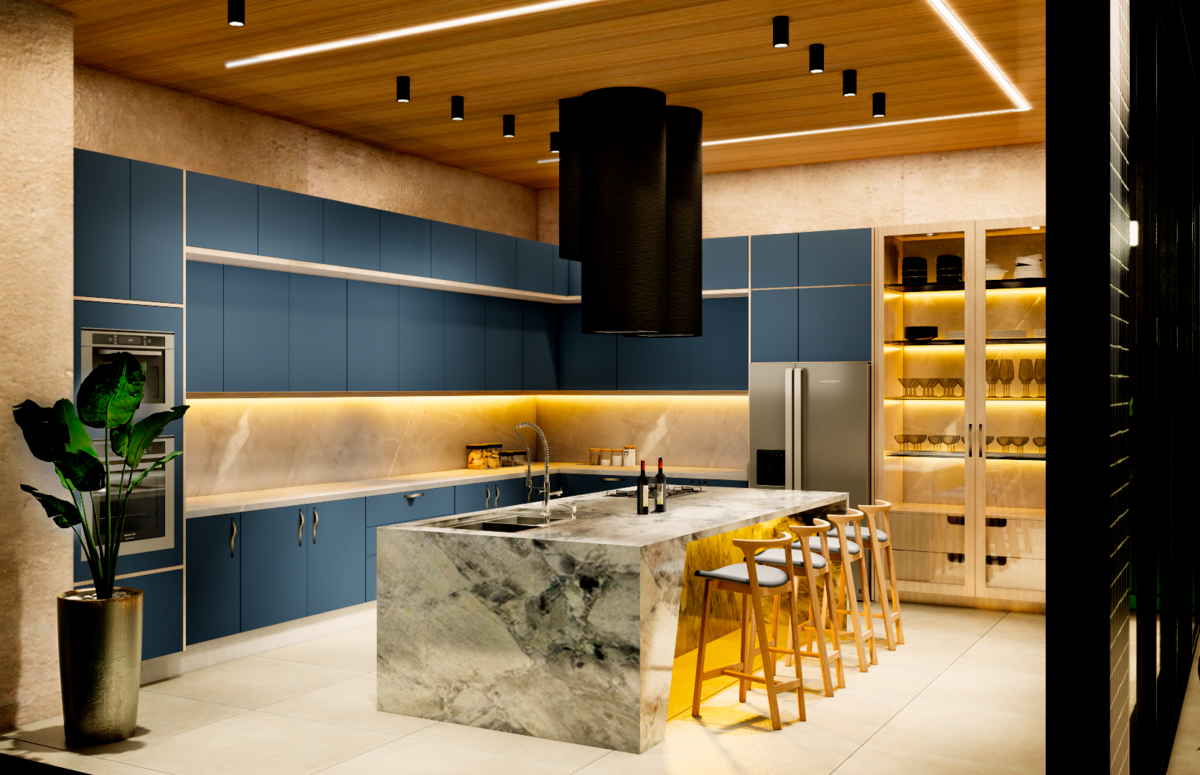 Interior residencial- cozinha moderna, cujo briefing são: Cor predominante azul escuro, bastante armários, iluminação com led, porcelanato e estilo contemporâneo industrial.